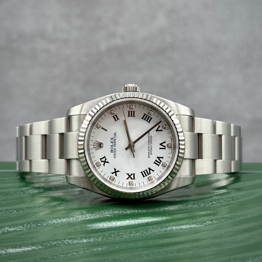 Wir verkaufen eine seltene Rolex Oyster Perpetual mit Diamant Ziffernblatt und Weißgoldlünette im unpolierten Topzustand.